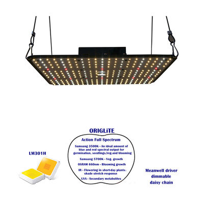 Samsung LM301H warm white 3500K + cool white 5700K + OSRAM deep red 660nm + Seoul far red 730nm + 385nm Scientifically engineered action full spectrum, designed for all phases, brings about more trichomes density, greater yields and potency.